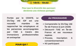 24 Mars 2026 Emploi DIV'DAY IAE IDF : Favoriser le recrutement local et la diversité Une initiative visant à rapprocher les employeurs des demandeurs d'emploi accompagnés par des structures d'insertion (SIAE).