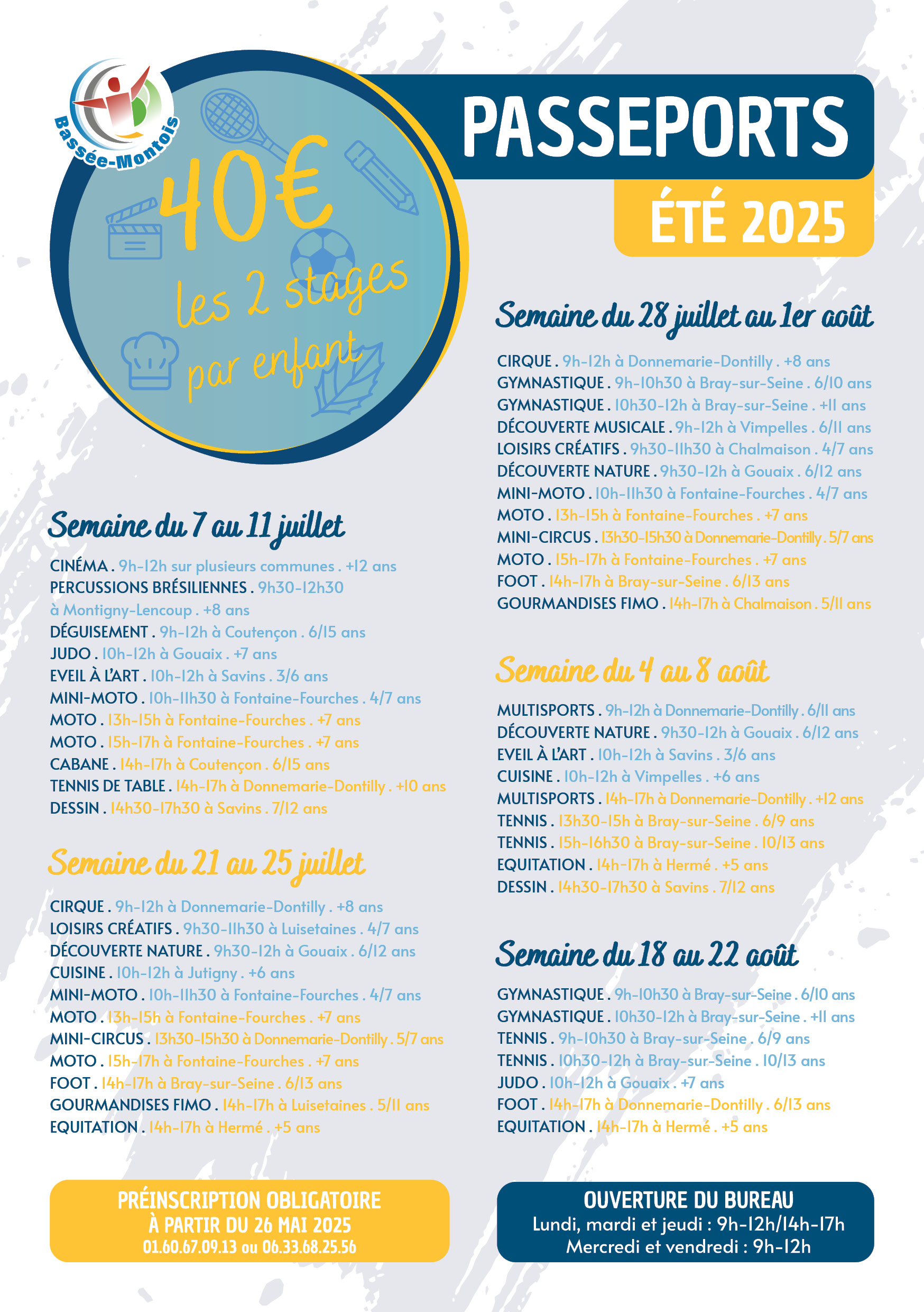 Passeports Passeports été 2025 Du 7 juillet au 22 août 2025 ! Préinscription obligatoire. Date de publication de la page et auteur de publication Créé le : 12/05/2025 - Mis à jour le : 12/05/2025 Télécharger Passeports été 2025 PDF 515.59 Ko Précédent Retour à la liste Suivant
