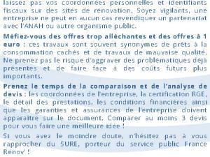 - Ne donnez pas suite au démarchage : il est interdit dans le secteur de la rénovation énergétique. Sur internet, ne laissez pas vos coordonnées personnelles et identifiants fiscaux sur des sites de rénovation. Soyez vigilants, une entreprise ne peut en aucun cas revendiquer un partenariat avec l’ANAH ou autre organisme public.