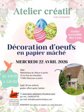 En ce moment 22 Avr 2026 Atelier, Villenauxe-la-Petite Atelier créatif à Villenauxe-la-Petite Le 22 avril 2026 ! Address: Villenauxe-la-Petite