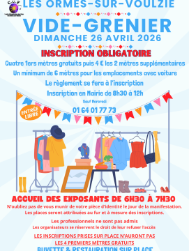 En ce moment 26 Avr 2026 Vide-grenier, Les Ormes-sur-Voulzie Vide-grenier au Ormes-sur-Voulzie Le 26 avril 2026 ! Address: Les Ormes-sur-Voulzie