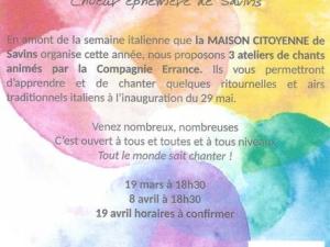 Atelier, Savins Ateliers de chant à Savins Les 19 mars, 8 avril et 19 avril 2026 ! Du 19 Mars 2026 au 19 Avr 2026 Time: 18h30m Savins Courriel Choeur éphémère de Savins Modalités : Sur inscription Localiser Choice of plan Précédent Retour à la liste Suivant