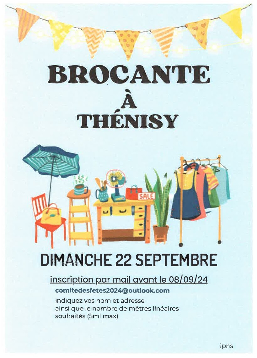 Brocante, Thénisy Brocante à Thénisy Le 22 septembre 2024 ! 22 Sept 2024 Thenisy Comité des fêtes de Thénisy Localiser Choice of plan Précédent Retour à la liste Suivant
