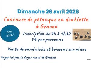 Concours, Gravon Concours de pétanque à Gravon Le 26 avril 2026 ! 26 Avr 2026 Gravon Foyer rural de Gravon Modalités : Inscriptions de 9h à 9h30 Tarification : 5€/ personne Localiser Choice of plan Précédent Retour à la liste Suivant