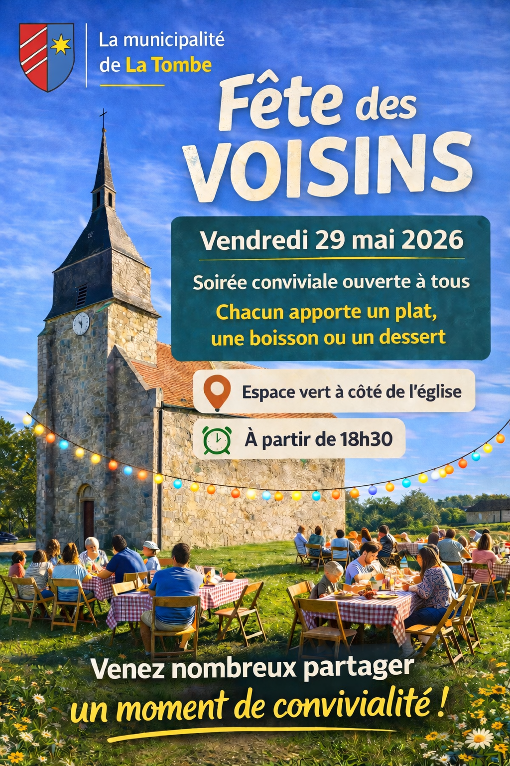 Fête, La Tombe Fête des voisins à La Tombe Le 29 mai 2026 ! 29 Mai 2026 Time: 18h30m La Tombe Commune de La Tombe Localiser Choice of plan Précédent Retour à la liste Suivant