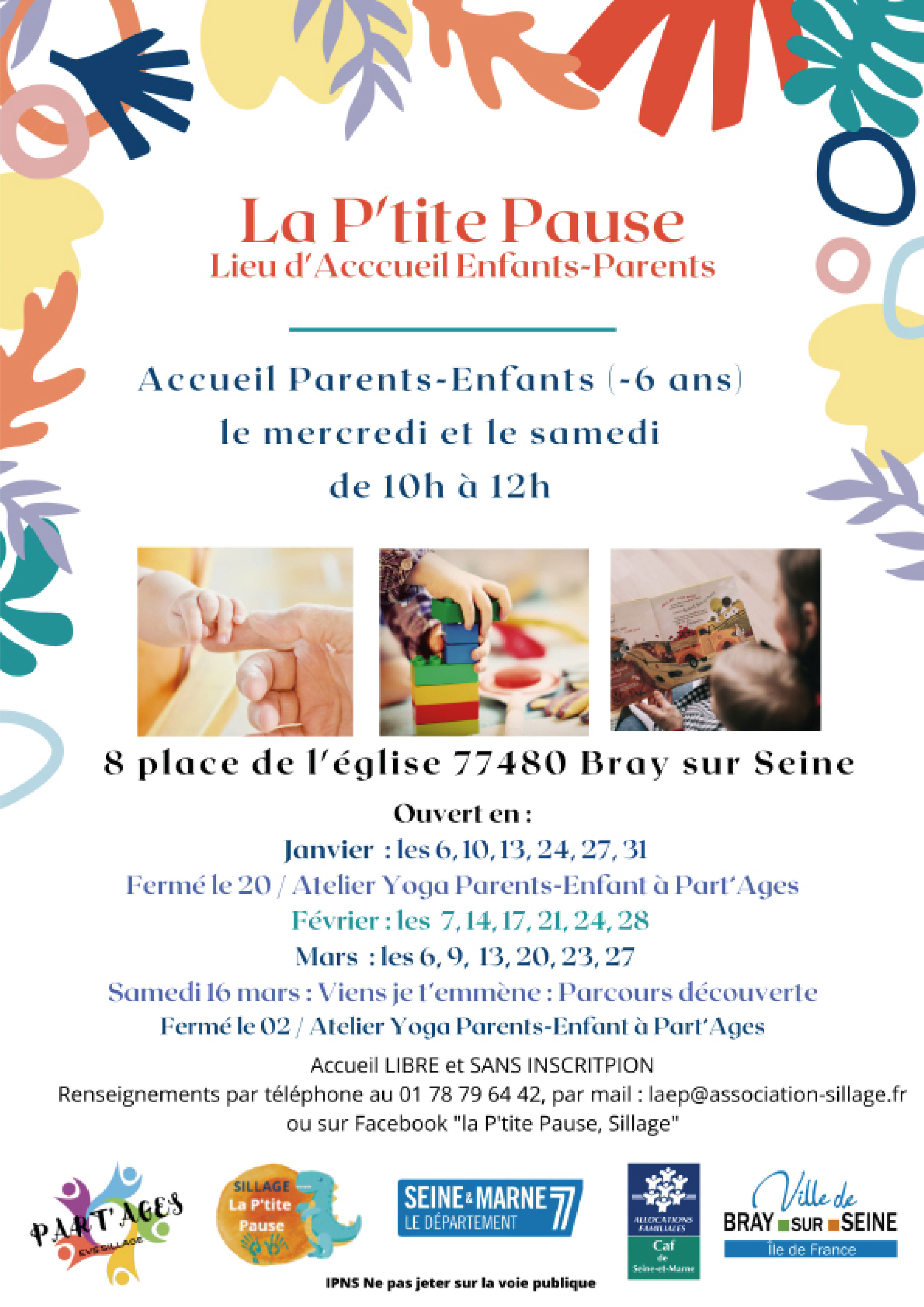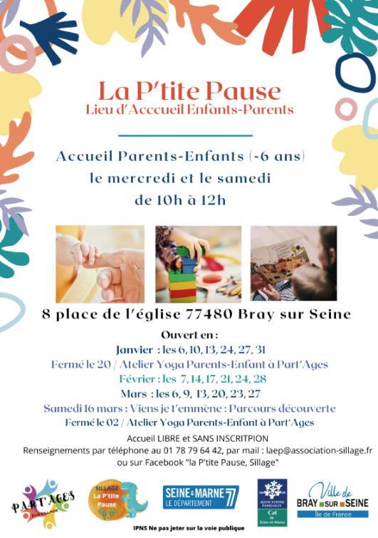 Enfance / Famille Programme La P’tite Pause - Janvier-Février-Mars Les horaires d'ouvertures de "La P'tite Pause", lieu d'accueil Enfants-Parents, en ce début d'année ! Date de publication de la page et auteur de publication Créé le : 8/01/2024 Télécharger Programme La P’tite Pause - Janvier-Février-Mars PDF 1.36 Mo Précédent Retour à la liste Suivant