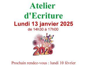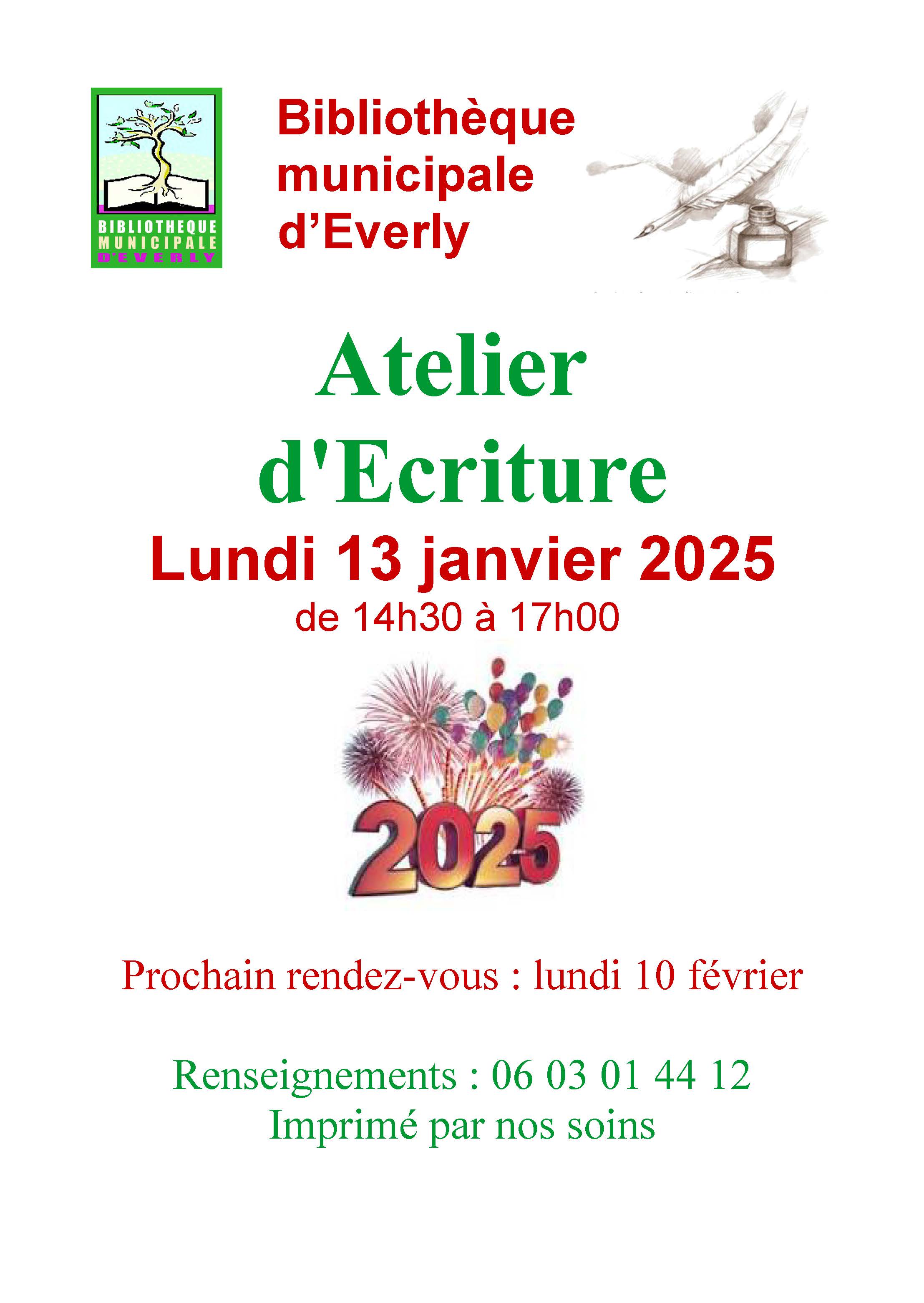 Atelier, Everly Atelier d'écriture à Everly Le lundi 13 janvier 2025 ! 13 Jan 2025 Time: 14h30m - 17h Everly 06 03 01 44 12 Bibliothèque municipale d'Everly Localiser Choice of plan Précédent Retour à la liste Suivant