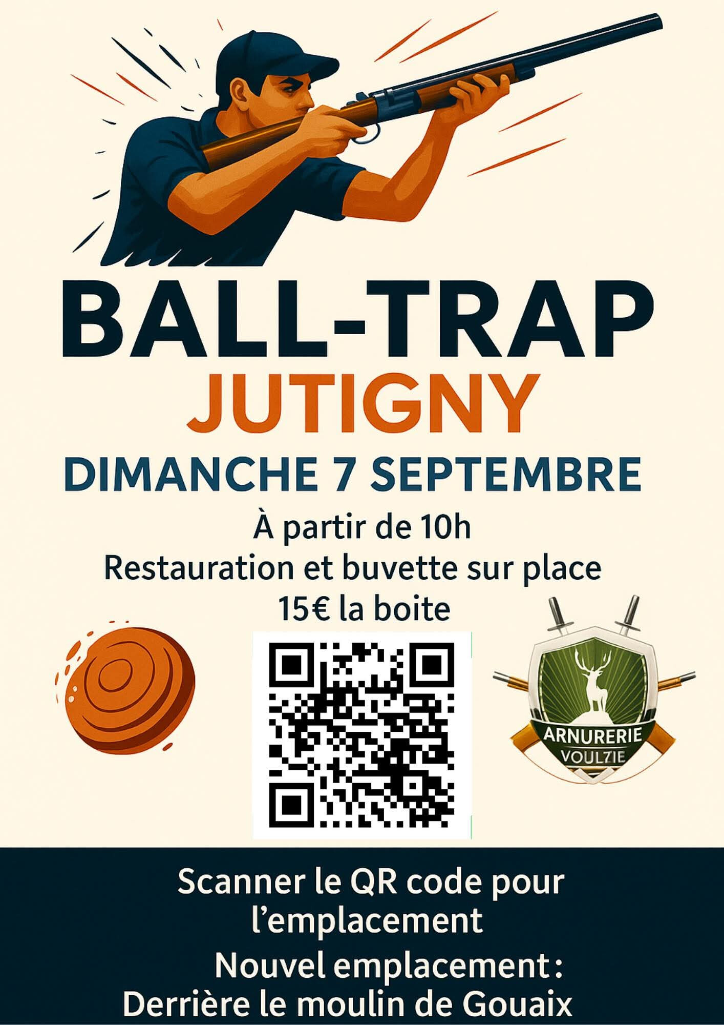 Animation, Jutigny Ball-trap à Jutigny Le 7 septembre 2025 ! 07 Sept 2025 Time: 10h Jutigny Modalités : Restauration et buvette sur place Tarification : 15€ la boite Localiser Choice of plan Précédent Retour à la liste Suivant