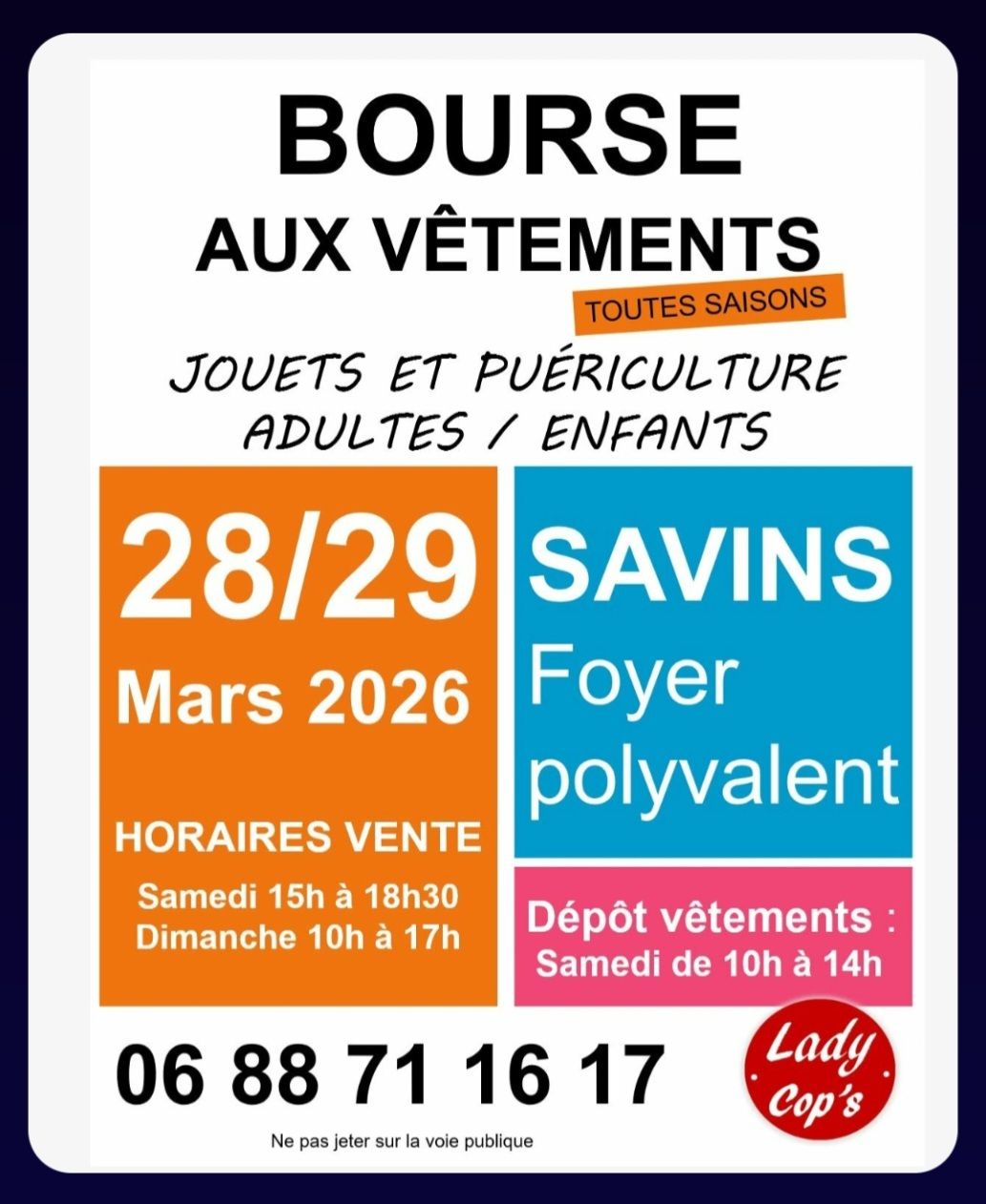 Savins Bourse aux vêtements à Savins Les 28 et 29 mars 2026 Du 28 Mars 2026 au 29 Mars 2026 Time: 15h - 17h Savins 06 88 71 16 17 Lady cop's Localiser Choice of plan Précédent Retour à la liste Suivant