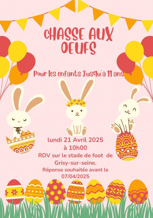 Animation, Grisy-sur-Seine Chasse aux oeufs à Grisy-sur-Seine Le 21 avril 2025 ! 21 Avr 2025 Time: 10h Grisy-sur-Seine Commune de Grisy-sur-Seine Localiser Choice of plan Précédent Retour à la liste Suivant