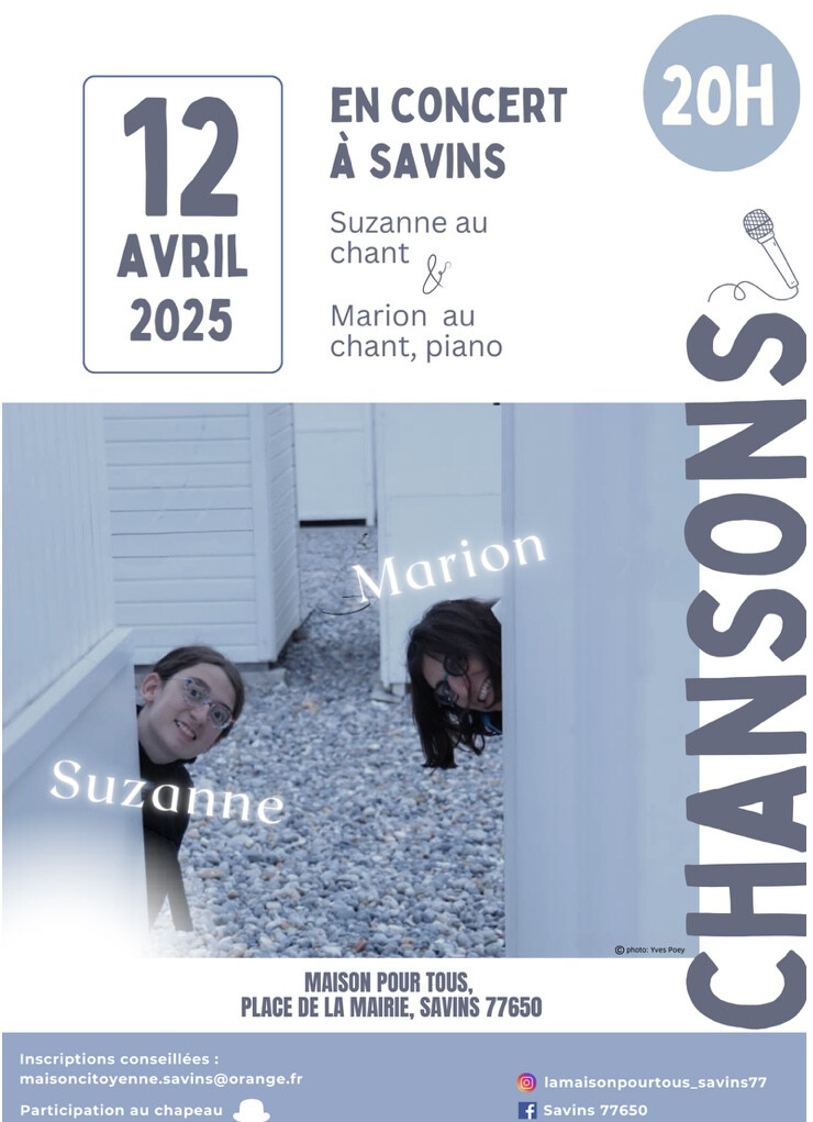 Concert, Savins Concert à Savins Le 12 avril 2025 ! 12 Avr 2025 Time: 20h Savins Courriel Commune de Savins Modalités : Inscription conseillées Tarification : Participation au chapeau Localiser Choice of plan Précédent Retour à la liste Suivant