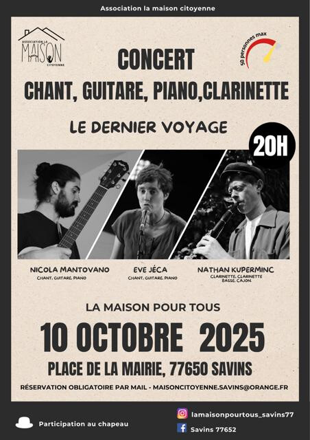 Concert, Savins Concert à Savins Le 10 octobre 2025 ! 10 Oct 2025 Time: 20h Savins Courriel Association la maison citoyenne Modalités : Réservation obligatoire par mail Tarification : Participation au chapeau Localiser Choice of plan Précédent Retour à la liste Suivant