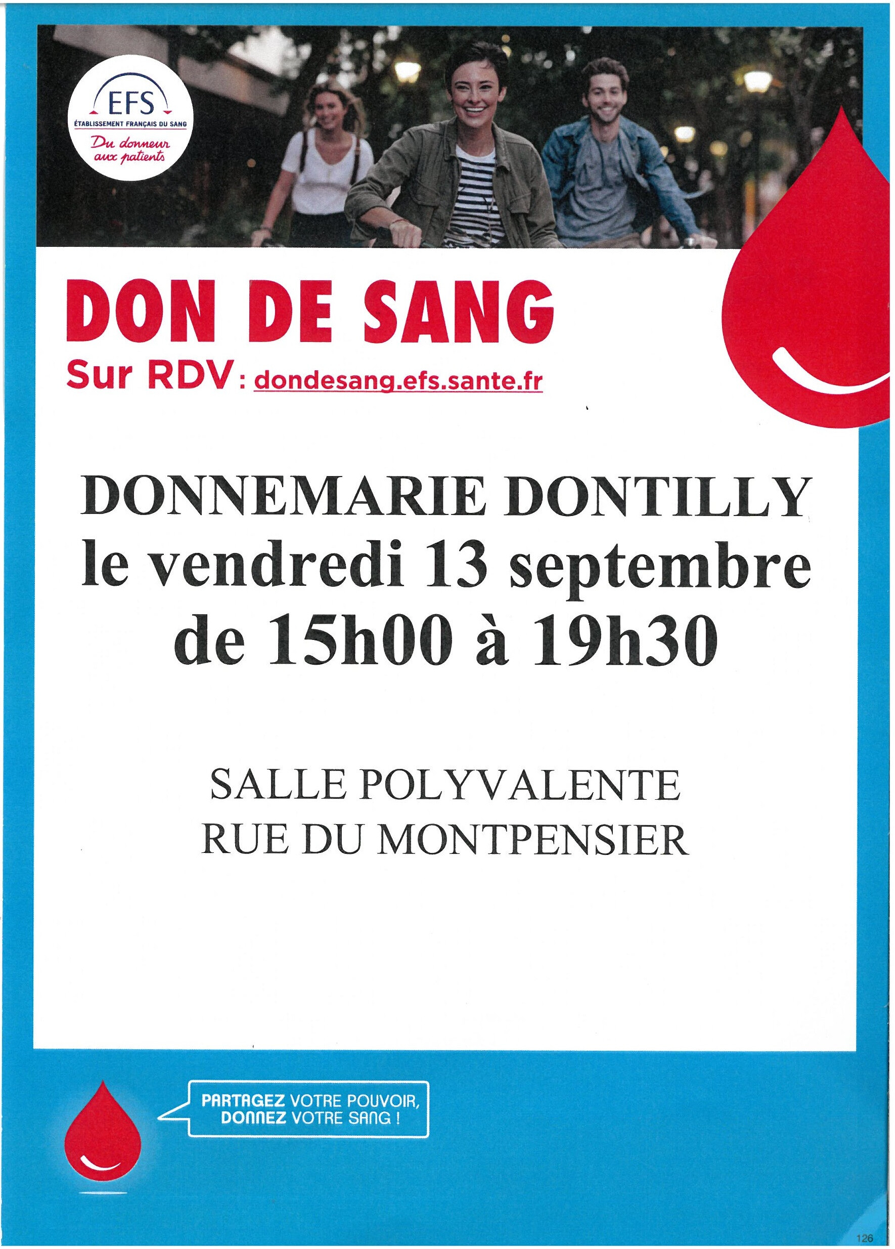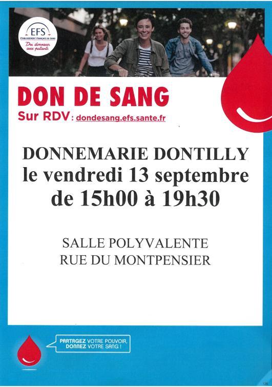 Donnemarie-Dontilly Don de sang à Donnemarie-Dontilly Le 13 septembre 2024 ! 13 Sept 2024 Time: 15h - 19h30m Donnemarie-Dontilly Site internet EFS Modalités : Sur rendez-vous via le site internet Localiser Choice of plan Précédent Retour à la liste Suivant