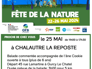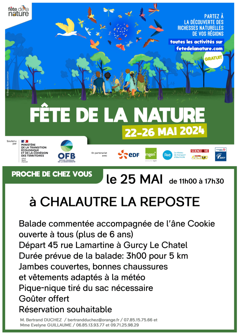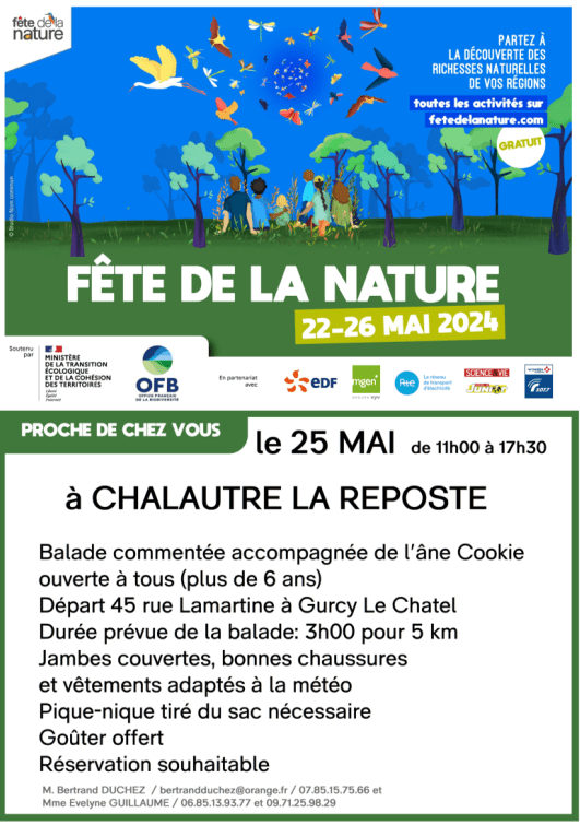Manifestation, Châtenay-sur-Seine Fête de la Nature à Chalautre la reposte Le 25 mai de 11h à 17h30 ! 25 Mai 2024 Time: 11h - 17h30m Châtenay-sur-Seine Localiser Choice of plan Précédent Retour à la liste Suivant