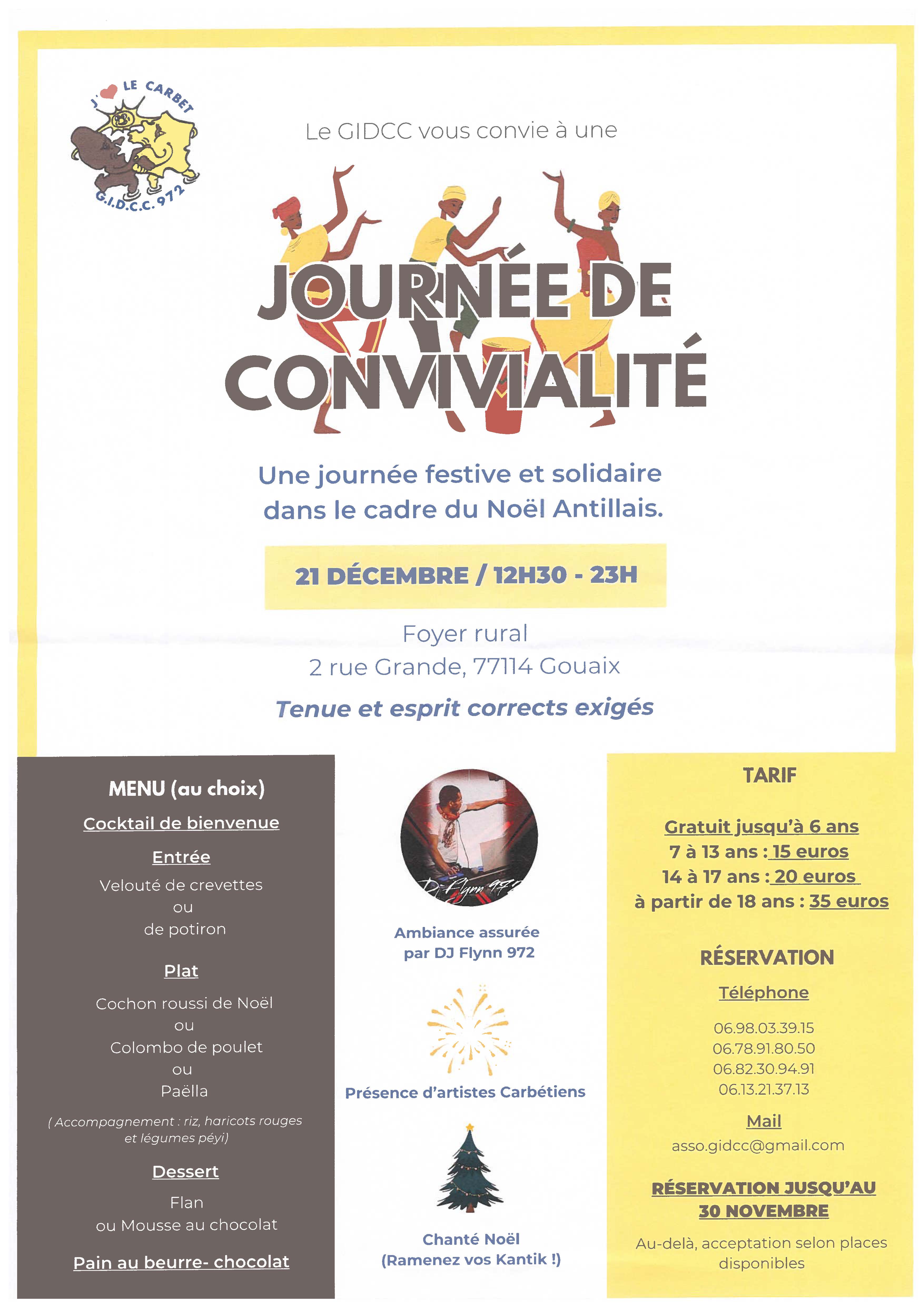 Animation, Gouaix Journée de convivialité à Gouaix Le 21 décembre 2024 ! 21 Déc 2024 Time: 12h30m - 23h Gouaix 06 98 03 39 15 Courriel GIDCC Modalités : Sur réservation jusqu'au 30 novembre Localiser Choice of plan Précédent Retour à la liste Suivant