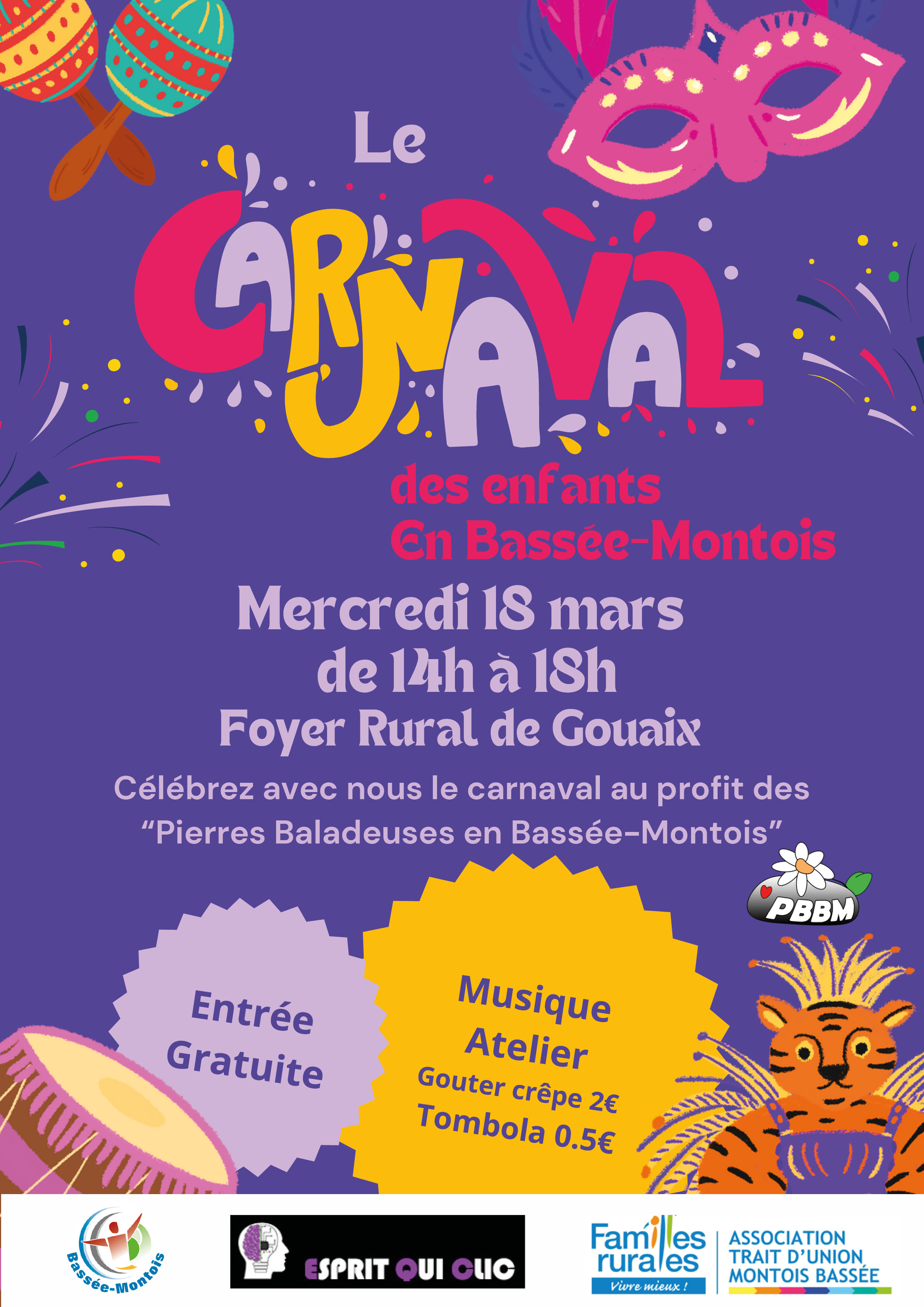 Carnaval, Gouaix Le Carnaval des enfants en Bassée-Montois Le 18 mars 2026 ! 18 Mars 2026 Time: 14h - 18h Gouaix Esprit qui Clic | Trait d'Union Montois Bassée Localiser Choice of plan Précédent Retour à la liste Suivant