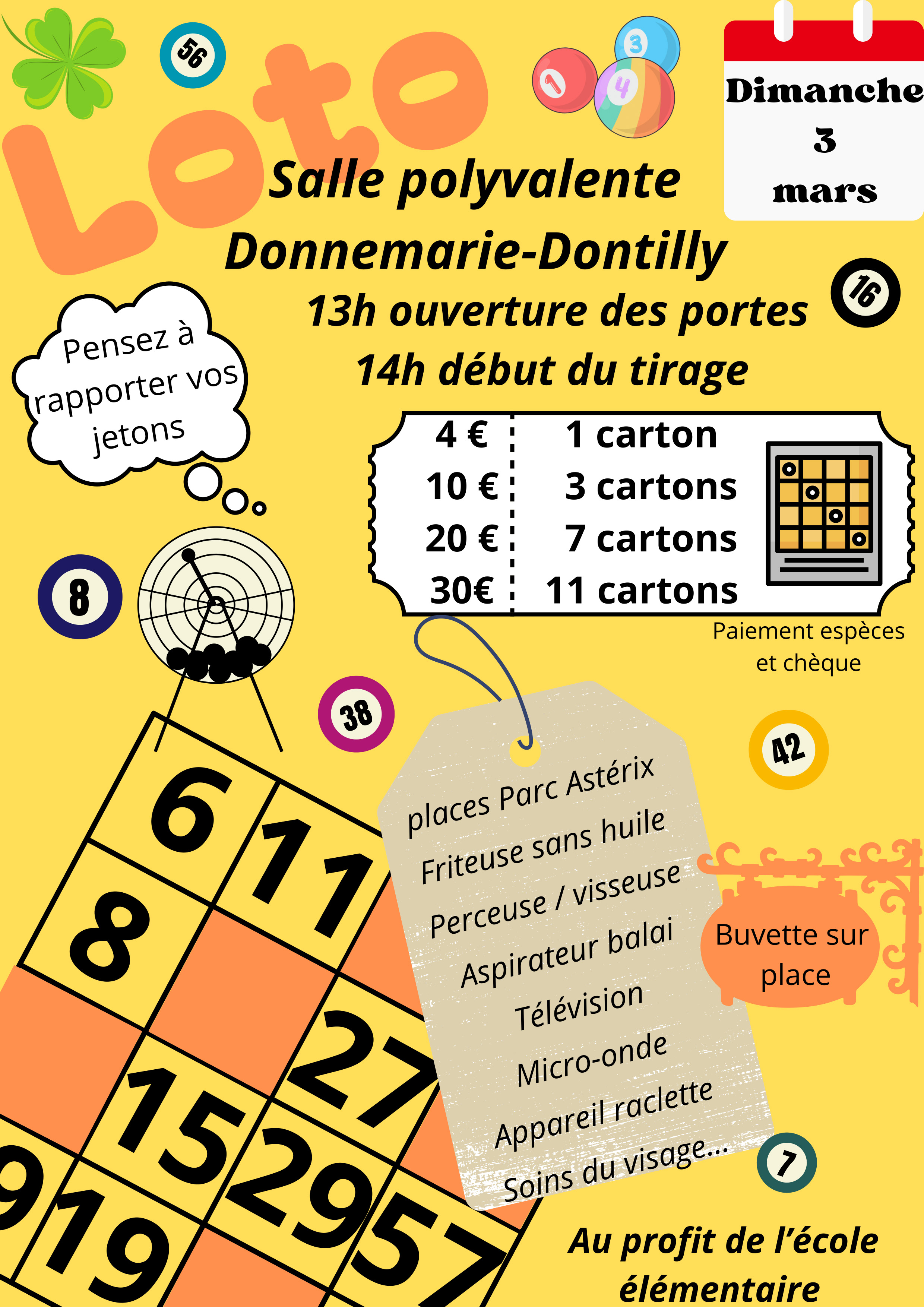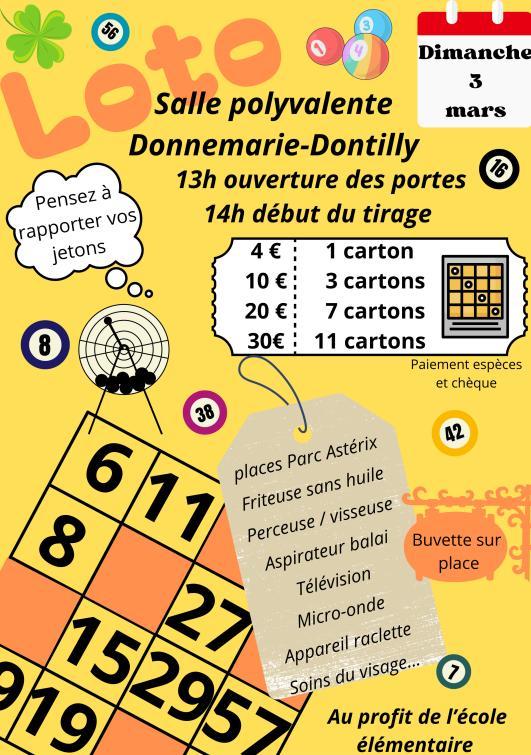 Loto, Donnemarie-Dontilly Loto de Donnemarie-Dontilly Tentez de remporter le gros lot ! 03 Mars 2024 Time: 13h Impasse du Stade, 77520 Donnemarie-Dontilly Modalités : Buvette sur place Tarification : Voir affiche Localiser Choice of plan Précédent Retour à la liste Suivant