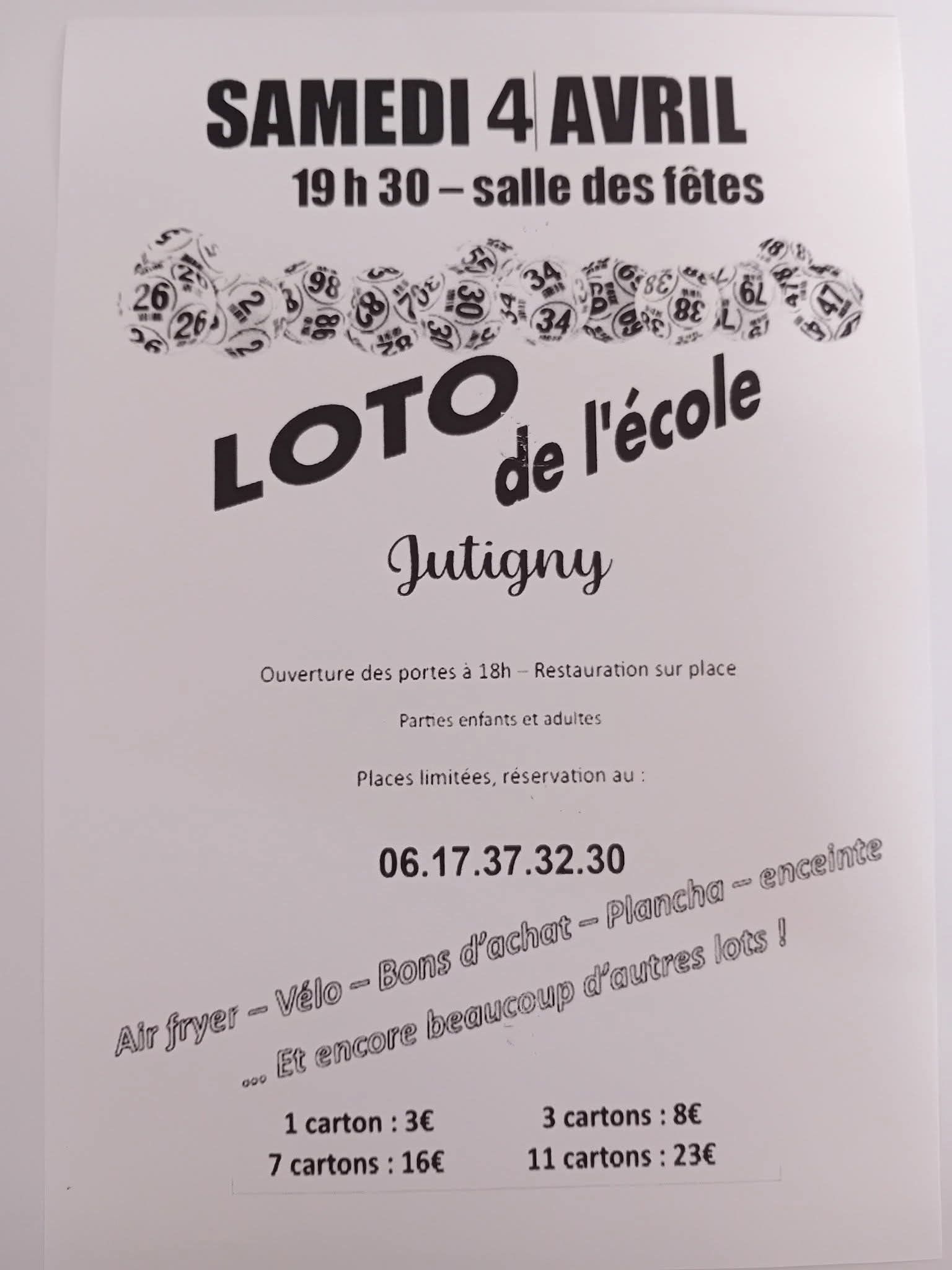 Loto, Jutigny Loto de l'école à Jutigny Le 4 avril 2026 ! 04 Avr 2026 Time: 19h30m Jutigny 06 17 37 32 30 Modalités : Restauration sur place Tarification : Voir affiche Localiser Choice of plan Précédent Retour à la liste Suivant