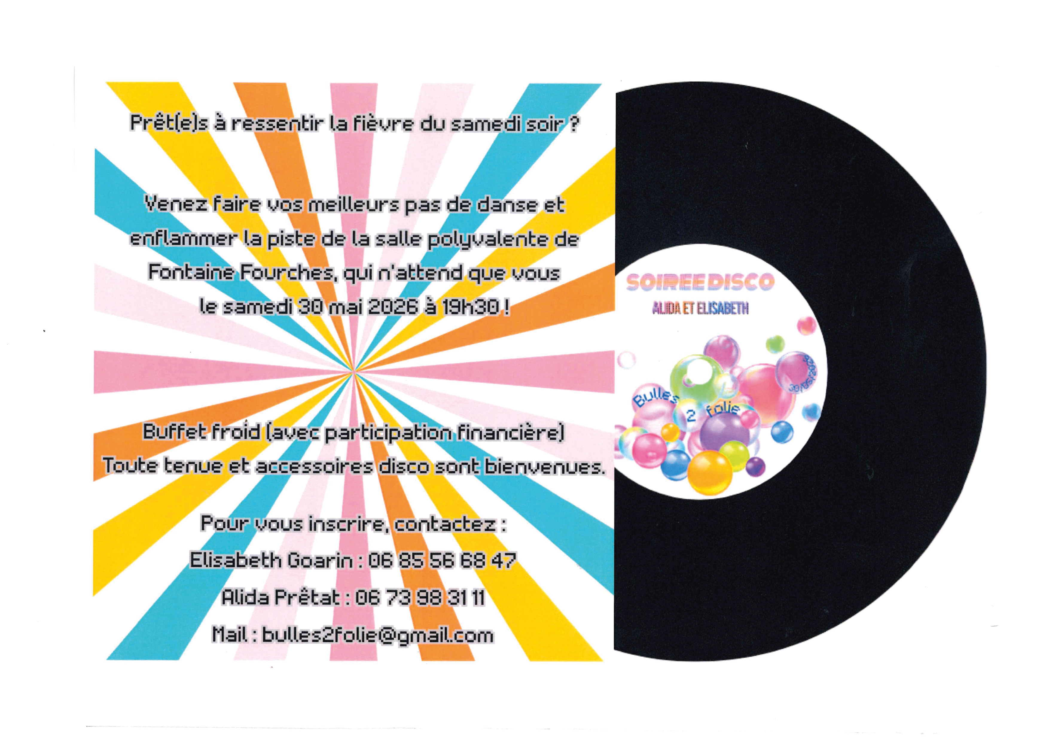 Animation, Fontaine-Fourches Soirée disco à Fontaine-Fourches Le 30 mai 2026 ! 30 Mai 2026 Time: 19h30m Fontaine-Fourches 06 85 56 68 47 Courriel Bulles de folie Localiser Choice of plan Précédent Retour à la liste Suivant
