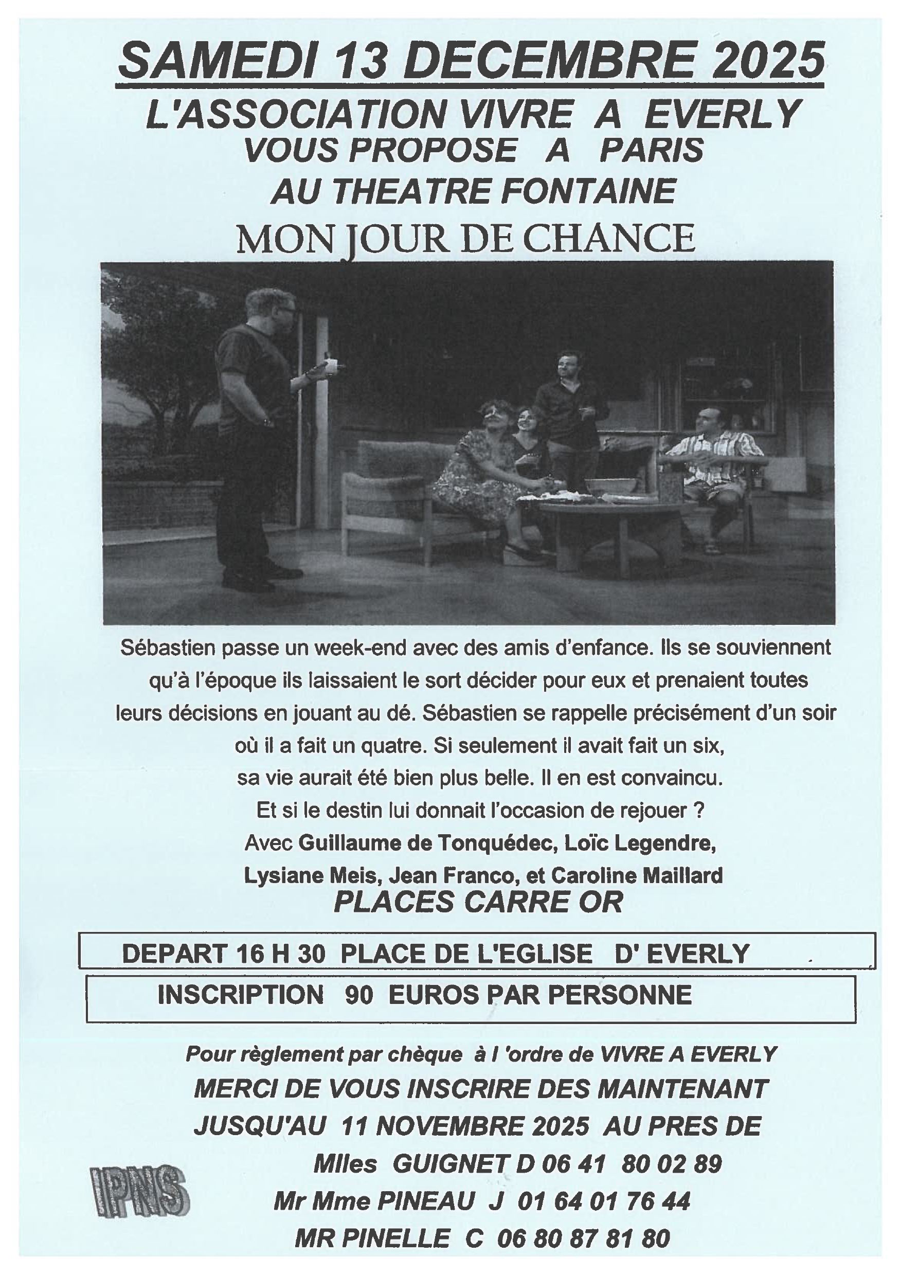 Spectacle, Everly Théâtre à Everly Le 13 décembre 2025 13 Déc 2025 Everly 06 41 80 02 89 Vivre à Everly Modalités : Sur inscription Tarification : 90€/ personne Localiser Choice of plan Précédent Retour à la liste Suivant