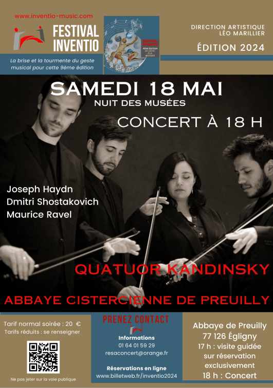 Festival INVENTIO, Concert, Egligny Visite de l'Abbaye de Preuilly et concert du Quatuor Kandinsky à Egligny Visite de l'Abbaye de Preuilly et concert du Quatuor Kandinsky à Egligny ! 18 Mai 2024 Time: 17h Preuilly, 77126 Égligny 01 64 01 59 29 Réservations en ligne Courriel Festival Inventio Télécharger Flyer Visite de l'Abbaye de Preuilly et concert du Quatuor Kandinsky PDF 1.27 Mo Localiser Choice of plan Précédent Retour à la liste Suivant