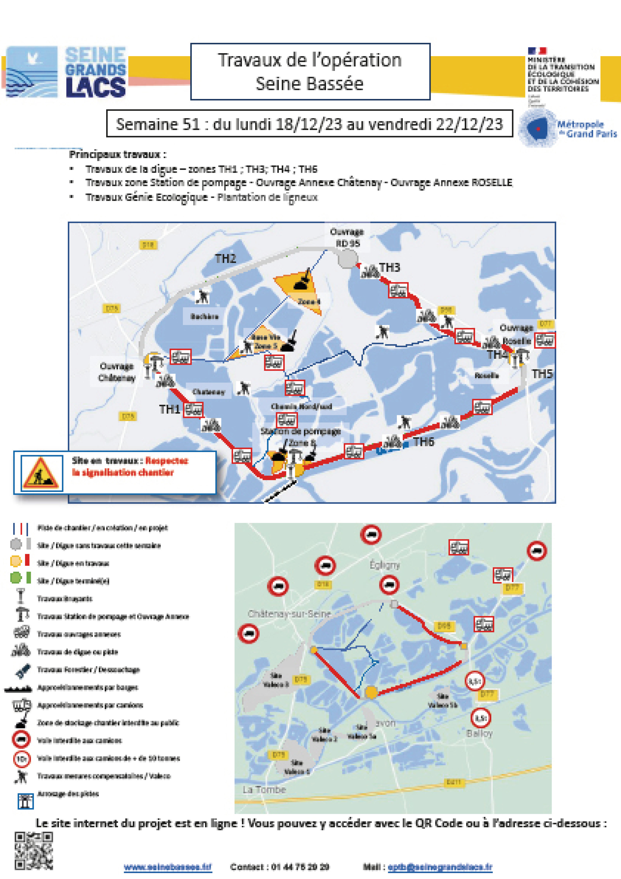 Aménagement Opération Seine Bassée Site pilote dans le secteur de Châtenay-sur-Seine - du 18 décembre 2023 au 22 décembre 2023 Pour la semaine, les principaux travaux de l'EPTB Seine Grands Lacs. Type de chantier : Aménagement Opération Seine Bassée Durée : Début : 18/12/2023 - 07h00 Fin : 22/12/2023 - 14h00 Fin des travaux : 2024 Routes impactées : RD 75, RD 18, RD 95 et RD 77 Date de publication de la page et auteur de publication Créé le : 25/04/2022, par Communauté de communes Bassée-Montois Télécharger affiche-la-bassee-x-s51_sgl2023.pdf PDF 1.23 Mo Localiser Choice of plan Précédent Retour à la liste Suivant