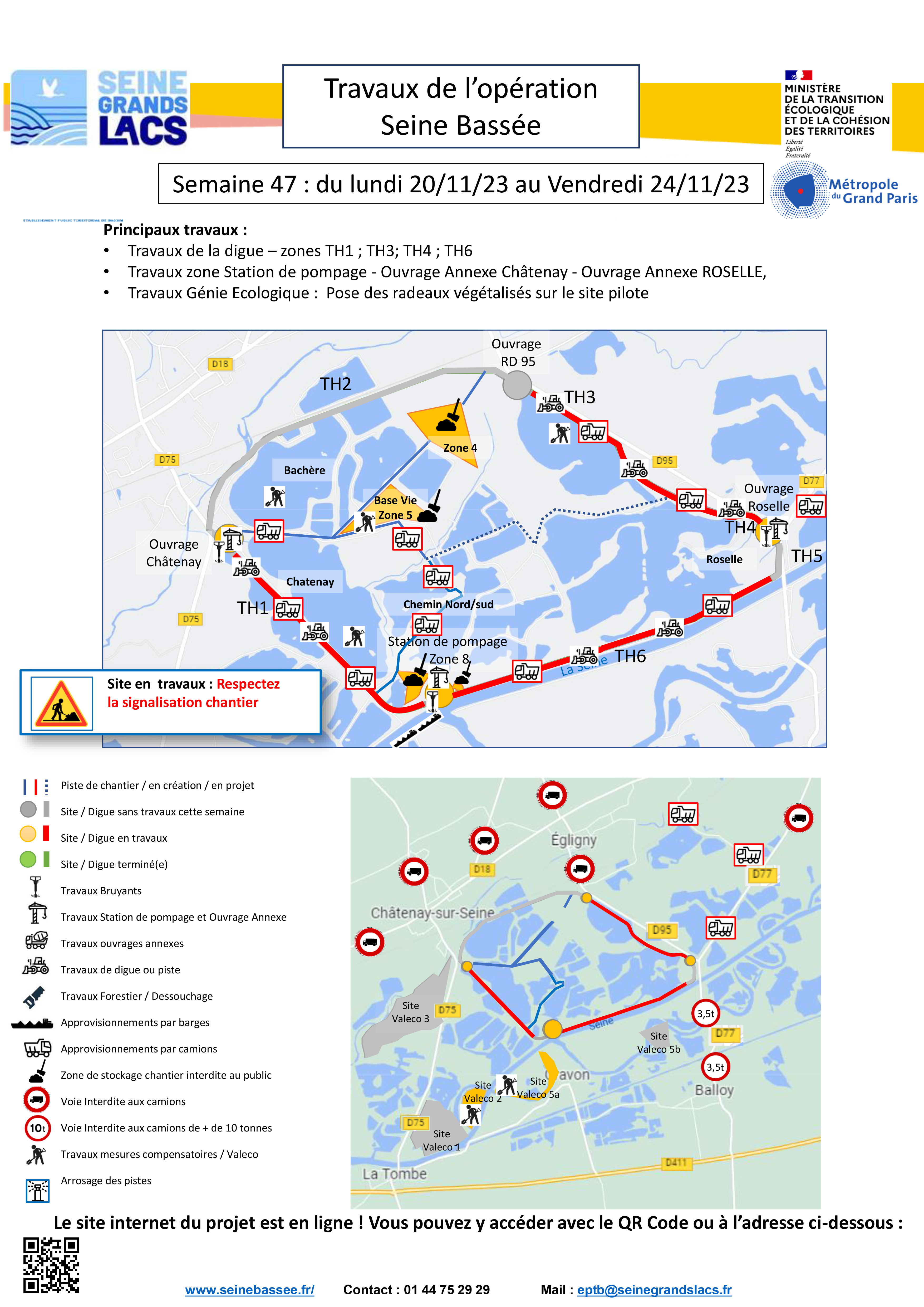 Aménagement Opération Seine Bassée Site pilote dans le secteur de Châtenay-sur-Seine - du 20 novembre 2023 au 24 novembre 2023 Pour la semaine, les principaux travaux de l'EPTB Seine Grands Lacs. Type de chantier : Aménagement Opération Seine Bassée Durée : Début : 20/11/2023 - 07h00 Fin : 24/11/2023 - 14h00 Fin des travaux : 2024 Routes impactées : RD 75, RD 18, RD 95 et RD 77 Date de publication de la page et auteur de publication Créé le : 25/04/2022, par Communauté de communes Bassée-Montois Télécharger affiche-la-bassee-x-s47_sgl2023.pdf PDF 456.56 Ko Localiser Choice of plan Précédent Retour à la liste Suivant