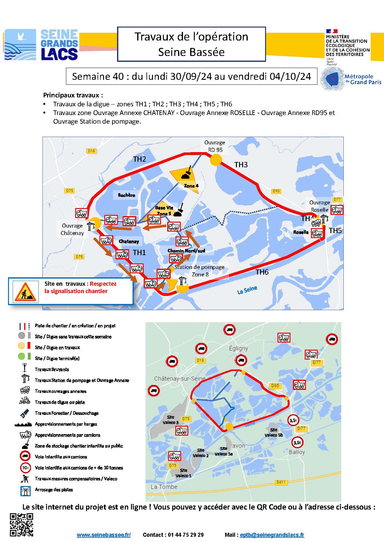 Aménagement Opération Seine Bassée Travaux de l'opération Seine Bassée - du 30 septembre 2024 au 4 octobre 2024 Pour la semaine, les principaux travaux de l'EPTB Seine Grands Lacs. Type de chantier : Aménagement Opération Seine Bassée Durée : Début : 30/09/2024 - 07h00 Fin : 04/10/2024 - 14h00 Fin des travaux : 2024 Routes impactées : RD 75, RD 18, RD 95 et RD 77 Date de publication de la page et auteur de publication Créé le : 21/03/2024, par Communauté de communes Bassée-Montois Télécharger affiche-la-bassee-y-s40_sgl2024.pdf PDF 450.87 Ko Localiser Choice of plan Précédent Retour à la liste Suivant